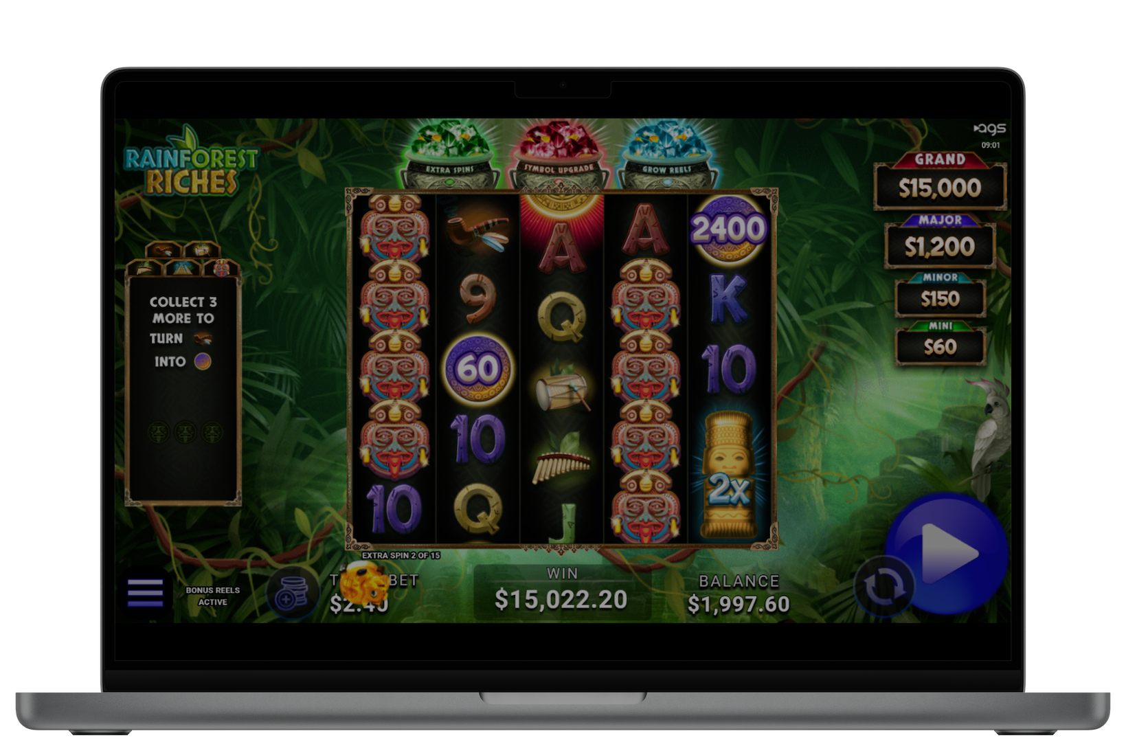 Rainforest Riches brings an elevated and exciting experience with gleaming Money Ball prizes, dynamic Wild Coins, and a powerful lineup of bonus features. Pot Bonuses ignite special rounds, with the Extra Spins Feature keeping the momentum going, and the Symbol Upgrade Feature boosting payout potential as play unfolds. The Grow Reels Feature expands the grid and introduces multipliers, allowing these features to stack together for thrilling, high-impact win moments. During the Mega Pick Bonus, revealing Wild Coins can also activate Pot Bonuses, unlocking even greater rewards and nonstop excitement.