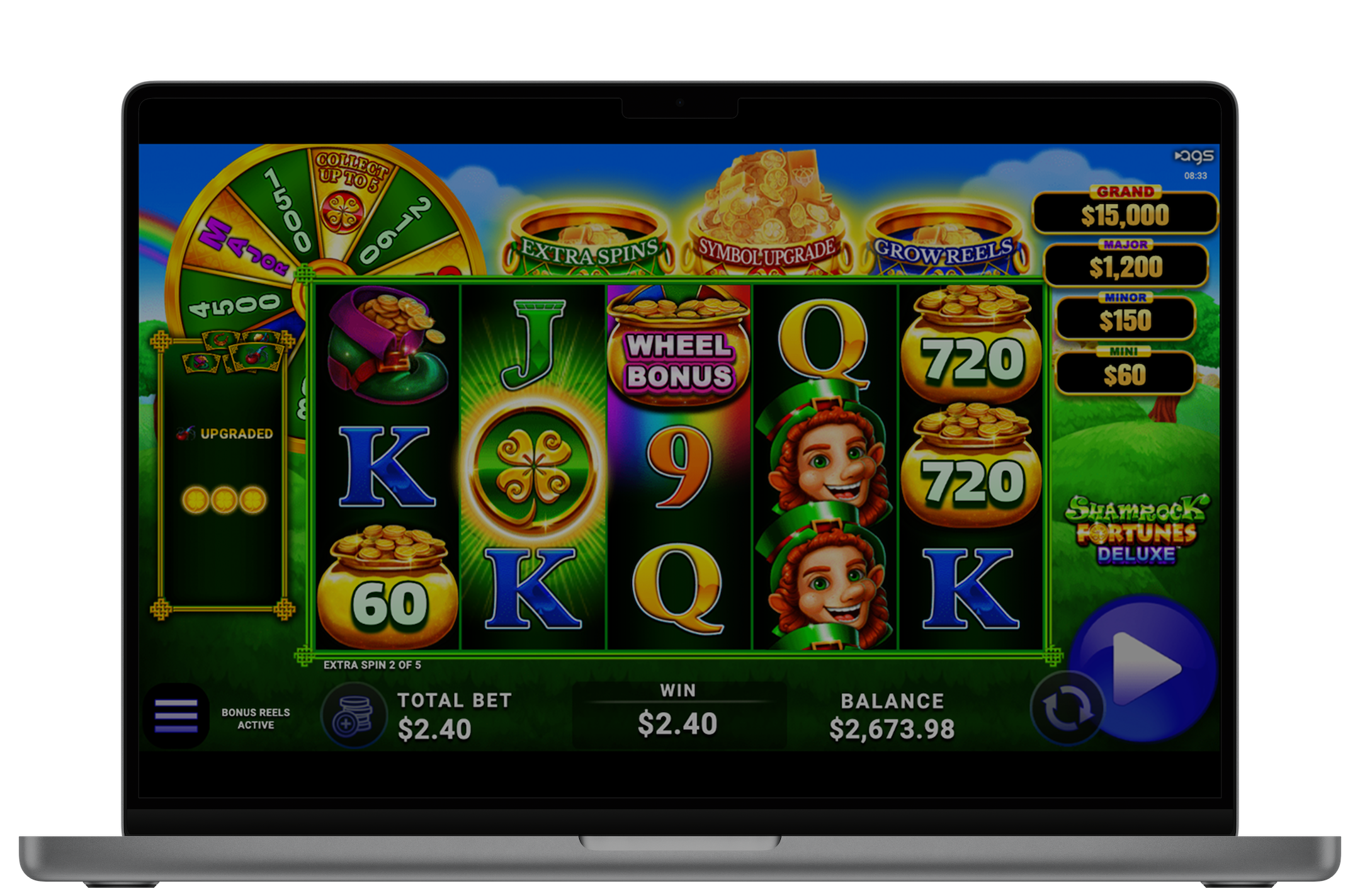 Shamrock Fortunes Deluxe builds on the charm of Shamrock Fortunes with richer features, bigger rewards, and even more ways to strike gold. Gold Pot Symbols deliver instant prizes across the reels, while Wild Coin Symbols transform to create dynamic wins and unlock exciting bonus opportunities. The action intensifies with the Wheel Bonus, where every spin can award jackpots, multipliers, or trigger the Extra Spins, Grow Reels, and Symbol Upgrades features. During the Extra Spins Bonus, these features can stack and evolve by transforming Gold Coin Symbols, depending on which features are active.