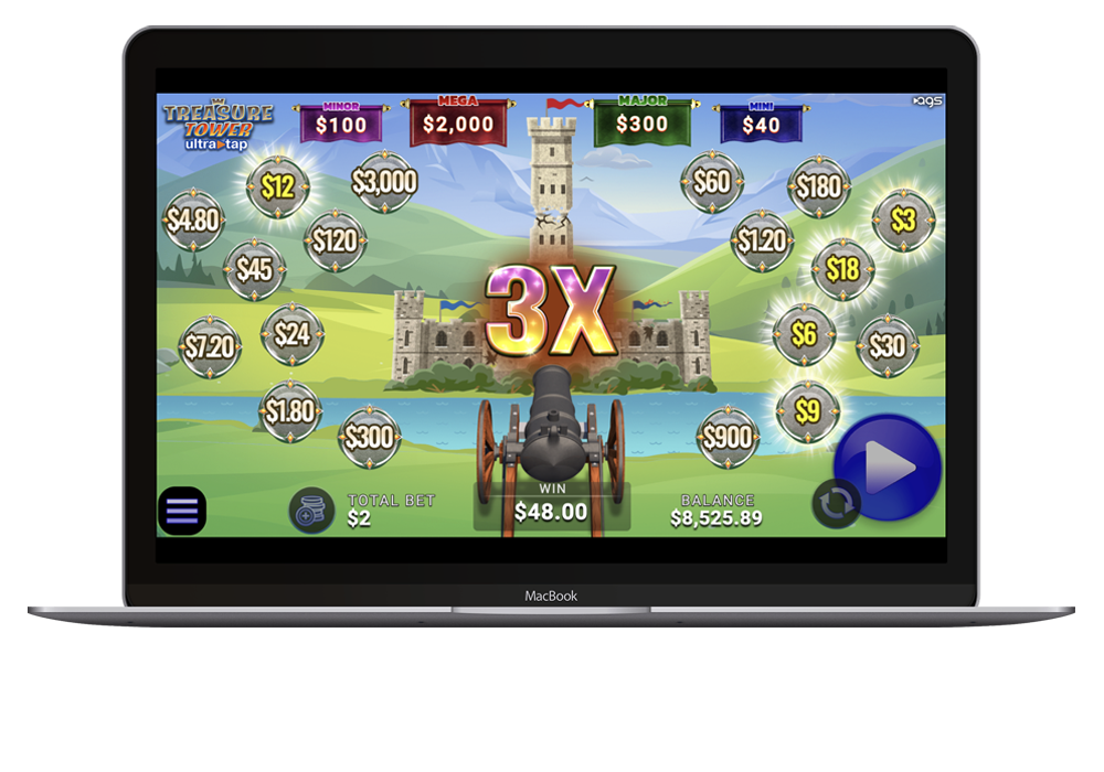 Treasure Tower UltraTap™ is a fast-paced instant win game set in a medieval world of castles and cannons. Each play fires a cannon at the fortress—hits reveal wins, which uncover 3 to 18 prize amounts on the screen, offering thrilling payout potential. The Pick Bonus Feature is triggered when the castle is completely destroyed, giving players a chance to match 3 identical prizes to win Free Games or one of 4 Jackpot Prizes. Free Games award 7, 10, or 15 additional plays and can be retriggered during the bonus round. Adding to the excitement, the Multiplier Feature can randomly activate on any hit, boosting the total win by 2X, 3X, or 5X.